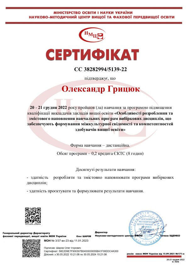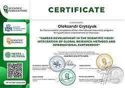 О.В. Грицюк – автор понад 90 наукових праць, серед яких 2 автореферати дисертацій, 2 монографії (одна науково-педагогічна, колективна, друга одноосібна), 72 статті (5 одноосібних, 2 у базі даних Scopus), 20 авторських свідоцтв та патентів.